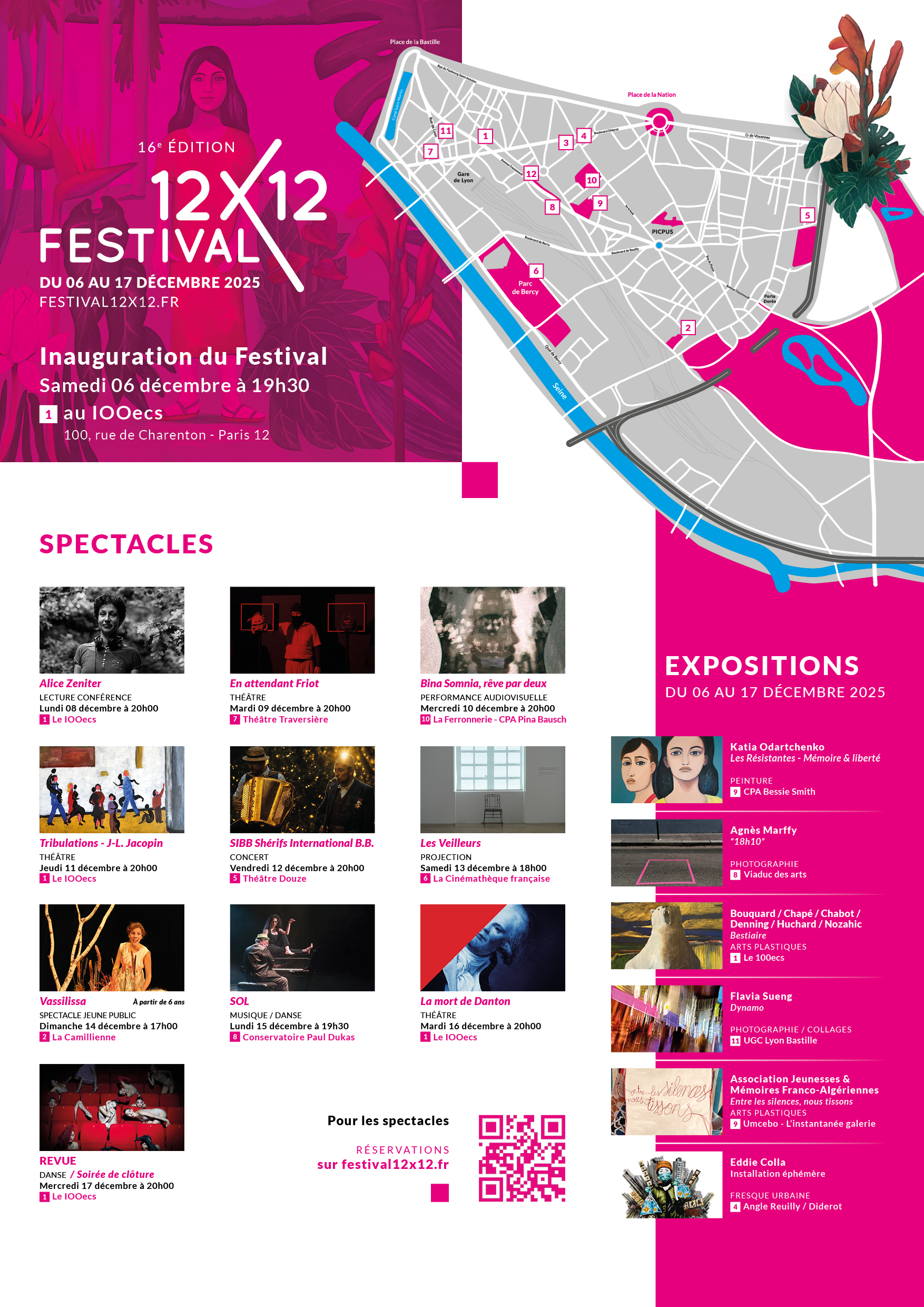 Le Festival 12X12 invite les Parisiennes et les Parisiens à vivre 12 jours d’expositions, de spectacles, de concerts et de performances, en accès libre et gratuit, dans 12 lieux partenaires du 12e arrondissement. Organisée par le 100ecs avec le soutien la Mairie du 12e et de la Mairie de Paris, la 16ème édition du Festival 12X12 propose de clôturer l’année avec une programmation diversifiée et pluridisciplinaire.